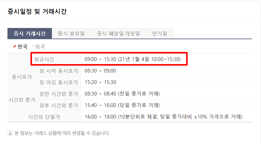 증시일정 및 거래시간입니다. 보통 초보 투자자는 정규시간에서만 주식투자매매를 하셔도 충분합니다. 주식투자 3년 차인 저도 아직까지 정규시장 이외에 매매를 해본 적이 단 1번밖에 없습니다. 정규시간만 거래해도 충분하시니 다른 시간은 그냥 참고만 하세요.