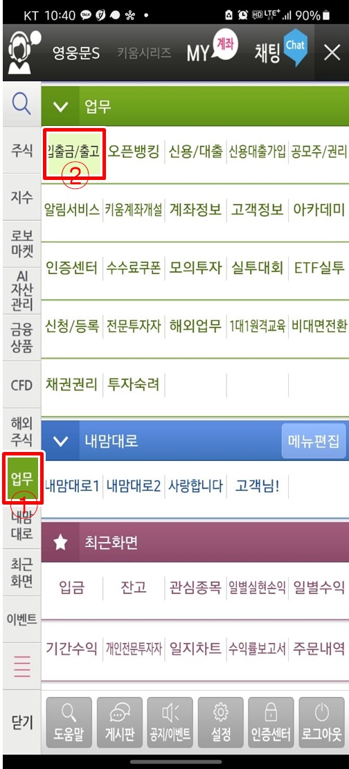 이제 주식투자를 본격적으로 하시기 위해 증권계좌에 돈을 넣는 방법을 설명드리겠습니다 주식 매매를 시작하시려면 주식 잔고에 투자금액이 입금이 되어야지 주식투자를 시작할 수 있습니다. 업무 버튼을 누르신 후에 입출금/출고 버튼을 누르시면요.
