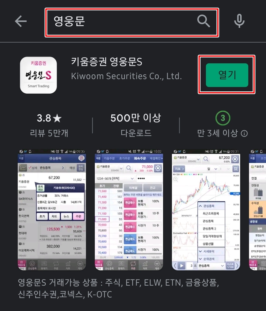 주식투자의 마인드와 기본적인 종목 선정을 어떻게 하는지 제가 투자하는 경험을 포스팅하였습니다. 계좌 개설을 완료하셨으면 키움증권 전용 거래 어플인 키움증권 영웅문 S를 설치하시면 됩니다 영웅문을 검색하셔서 설치 버튼을 클릭하시면 설치가 됩니다.