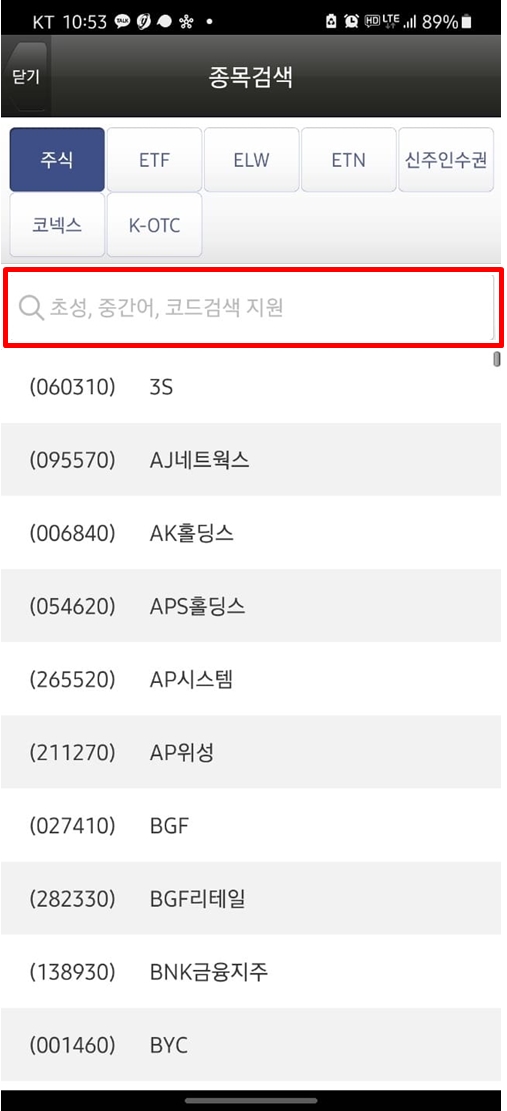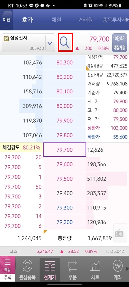 위에 보시는 게 호가창인데 지금은 삼성전자가 보이지만 다른 종목을 매매하시려면 빨간 박스 안에 검색 버튼을 누르시면 됩니다.