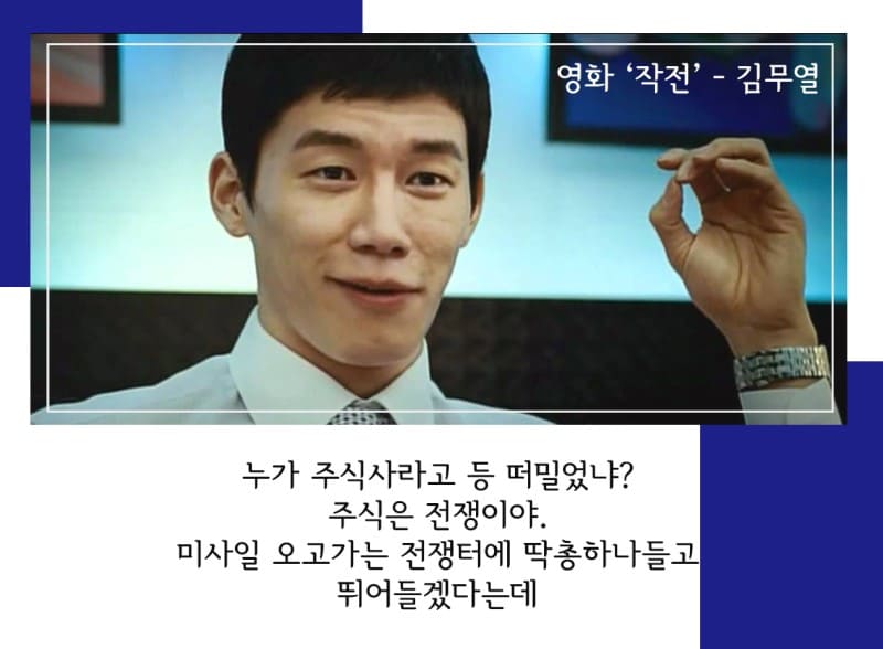 위 그림은 영화 작전에서 김무열 씨가 하신 말씀입니다 주식투자는 전쟁터라고 하는데 딱총 하나 들고 뛰어들겠다고 합니다 이 말은 주식투자에 있어서 준비가 되지 않으면 신중하라는 말씀 같습니다. 우리 모두 주식투자를 하기 앞서서 전쟁터에 들어가기 전에 많은 준비를 하고 투자에 임했으면 좋겠습니다. 이상으로 포스팅을 마치겠습니다. 감사합니다.