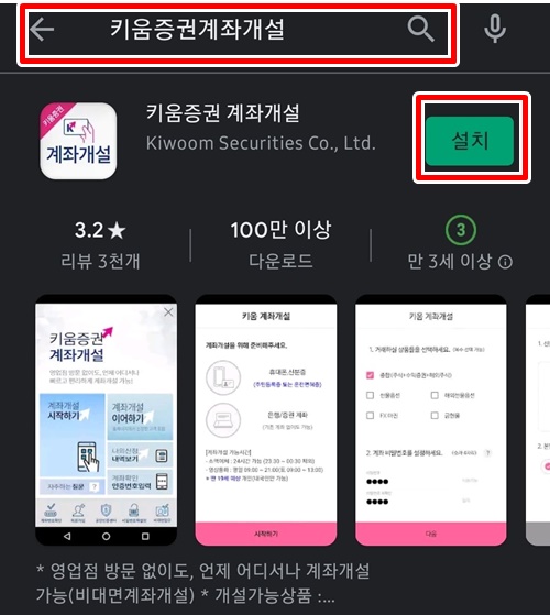 구글 플레이스토어 또는 앱스토어에서 키움증권계좌 개설이라고 검색을 하면 키움증권 계좌 개설 설치버튼이 있습니다.클릭 하시고 다운로드 받으시면서 주민등록증 또는 운전면허증을 미리 준비하세요.