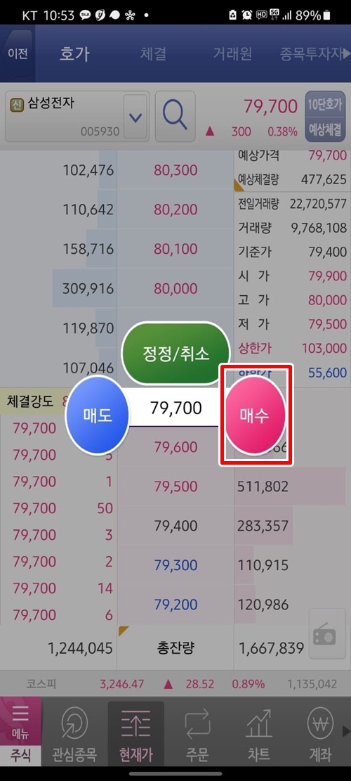 호가창에 보시게 되면 가격이 나오는데 아무 데나 클릭을 하시면 매도 버튼과 매수 버튼이 창이 열리게 되는데 매수를 누르신다고 바로 매수가 되는 게 아니기 때문에 매수 버튼을 누르시면 됩니다.